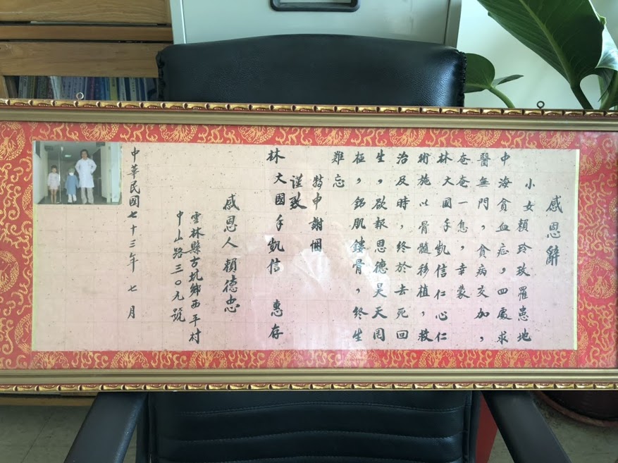 林凱信醫師是亞洲地區首例成功骨髓移植案例的主治醫師,而照片中賴玲玫女士是他返台後頭幾例骨髓移植成功的海洋性貧血案例(以前稱作地中海型貧血,後因基因定序確認型態不同而更名)。請各位看照片中出自賴爸爸賴德忠先生的謝辭。